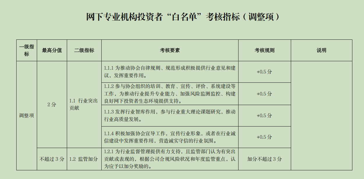 此外,“白名单”还实行扣分和加分机制,根据申请主体及其管理的配售对象在业务类型、业务开展状况、人员队伍建设状况、合规风控状况等方面的表现进行相应加分或扣分。这一机制将有助于推动行业健康发展,营造良好行业生态环境。