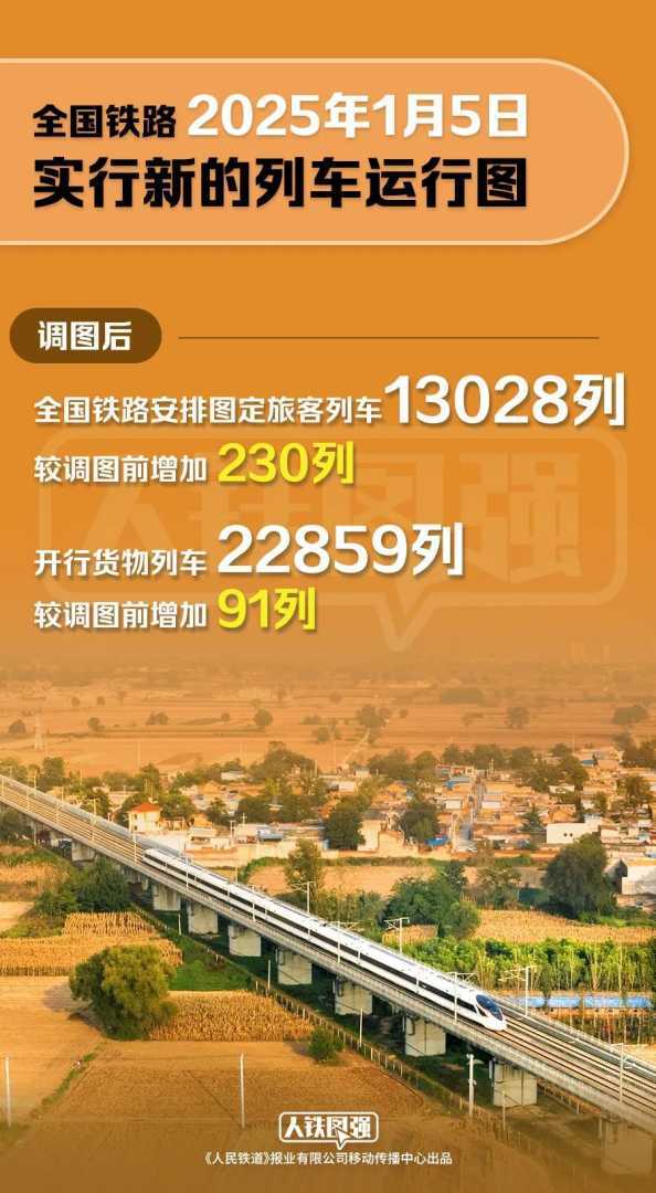 1月5日起,全国铁路启用新列车运行图,旅客列车增至13028列,货物列车增至22859列,运输能力和服务品质大幅提升。此次调整旨在优化资源配置,适应市场需求,服务国家重大战略。