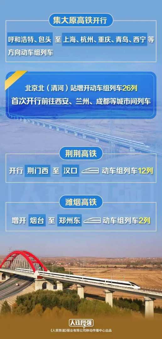 集大原、荆荆高铁等新线助力中西部高铁网发展,呼和浩特、包头等城市新增动车通达上海、杭州等地。同时,优化京沪、京广等高铁线路,增开标杆列车,提升运输效率。