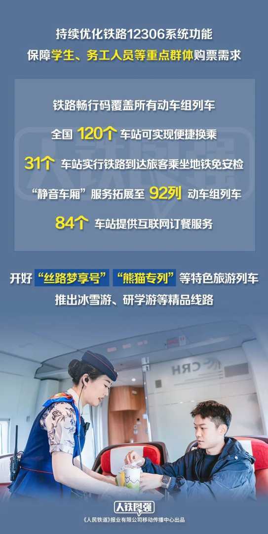 铁路部门还推出多项便民措施,如优化12306系统功能、推行数字化客运电子发票等,提升旅客购票和服务体验。同时,加强老幼病残孕等重点旅客服务,推广特色旅游列车,激活旅游消费。