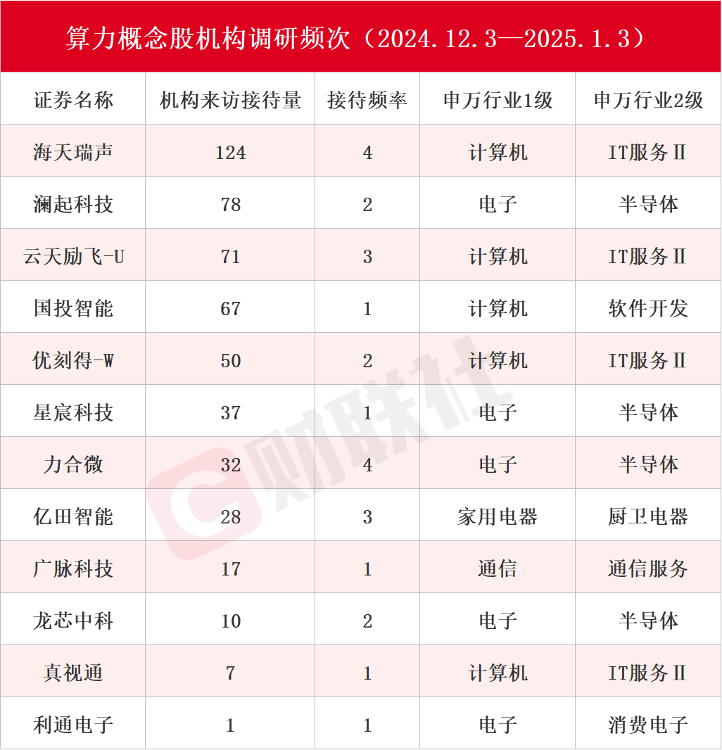 Choice数据显示,2024年12月3日至2025年1月3日期间,多家算力概念股获得机构调研,包括海天瑞声、澜起科技、云天励飞-U等。其中,海天瑞声以124家机构来访接待量位居榜首,其主营业务为训练数据的生产和销售,储备算力可满足日常研发需求。澜起科技则以78家机构来访接待量排名第二,公司专注于数据处理及互连芯片设计,正在研发新一代AI芯片。云天励飞-U同期机构来访接待量达71家,作为边缘AI领军企业,公司积极布局边缘AI发展的技术和业务。