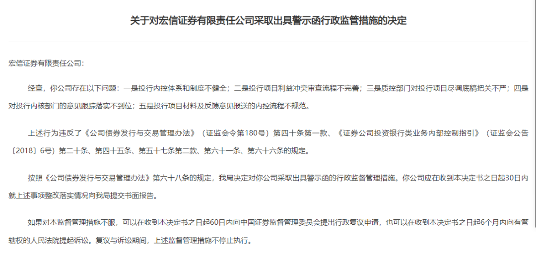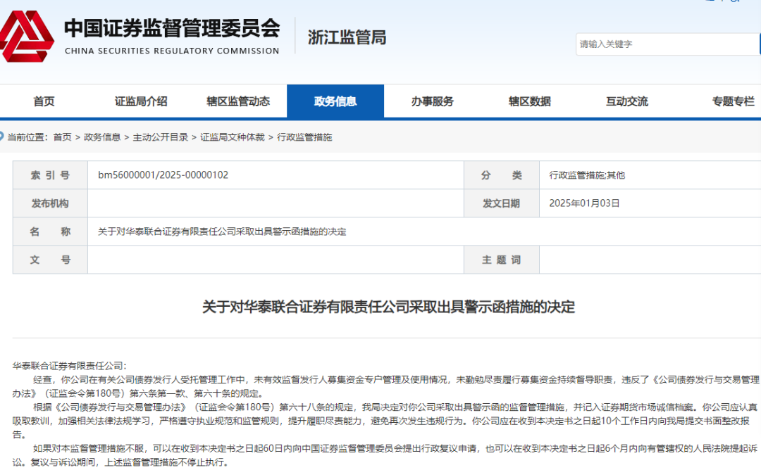 开年以来,国内券商因投行业务违规问题频繁受到各地证监局的处罚。1月3日,浙江证监局对华泰联合证券采取了出具警示函的监督管理措施,原因是其在公司债券发行人受托管理工作中未有效监督发行人募集资金的使用情况,未尽到持续督导职责。而就在前一天,宏信证券也因投行业务存在多处合规内控问题被四川证监局出具了警示函。
