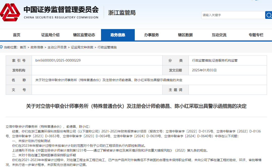除了券商,会计师事务所等中介机构也面临着严格的监管。1月2日,山东证监局披露,华安证券一营业部员工私下接受客户委托买卖证券,被采取出具警示函的行政监督管理措施。而浙江证监局则对立信中联会计师事务所及其注册会计师在嘉澳环保财务报表审计项目中存在的问题采取了出具警示函的监督管理措施。这些问题包括未按计划执行控制测试、未对在建工程转固事项保持职业怀疑等。