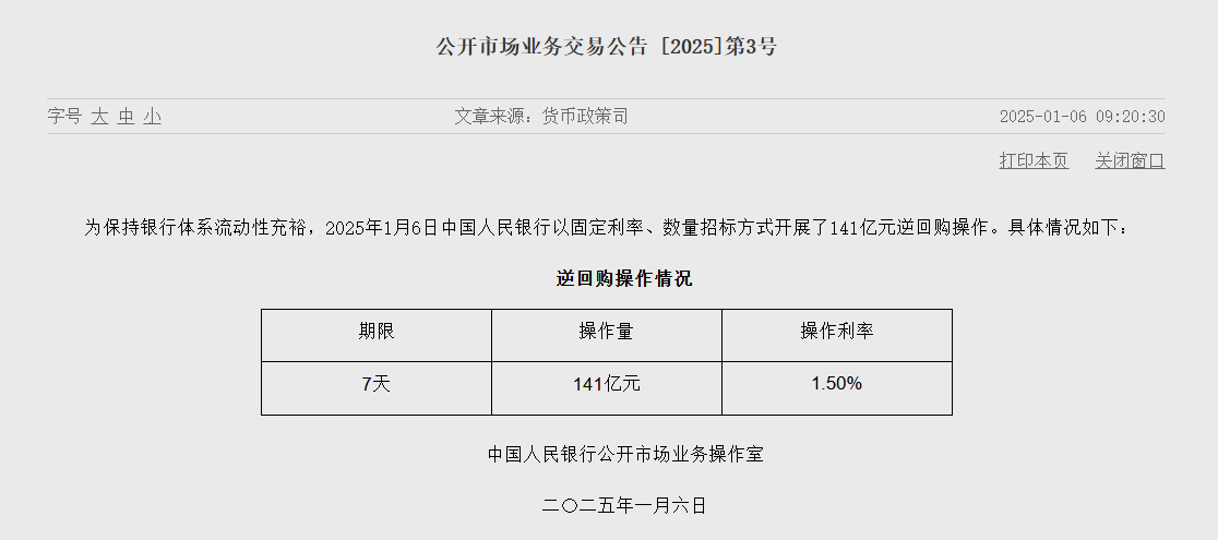 据中国人民银行官方网站公布的信息,2025年1月6日,中国人民银行通过固定利率、数量招标的方式成功进行了总额为141亿元人民币的逆回购操作。此次逆回购操作的中标利率维持在1.50%,与前期保持一致。然而,由于当天有891亿元的7天期逆回购到期,导致实际净回笼资金达到750亿元。