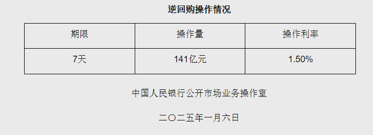 中国人民银行于2025年1月6日以固定利率、数量招标方式开展了141亿元逆回购操作,旨在保持银行体系流动性充裕,为经济发展提供金融支持。