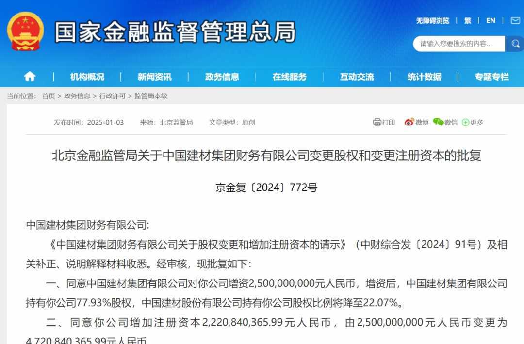 近日,北京金融监管局正式批复了中国建材集团有限公司(简称“中国建材集团”)对中国建材集团财务有限公司(简称“中国建材集团财务公司”)的增资计划。此次增资额度高达25亿元人民币,增资完成后,中国建材集团将持有中国建材集团财务公司77.93%的股权,而原有的中国建材股份有限公司持股比例则相应调整至22.07%。