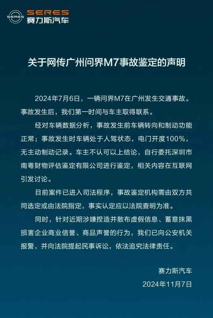 本次诉讼的背景源于去年7月6日,一辆问界M7在广州发生的一起交通事故。事故车主在社交媒体上发布了一份由南粤财物评估鉴定公司出具的鉴定报告,报告指出刹车踏板失灵、行车记录仪数据缺失,并质疑赛力斯汽车销售有限公司出具的事故报告存在人为修改。这一事件迅速引发广泛关注。