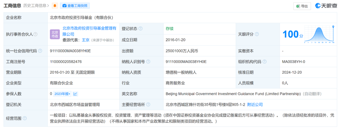天眼查数据显示,北京市政府投资引导基金(有限合伙)的出资额近期实现了大幅度增长,由原先的1000.1亿元跃升至2500.1亿元,增幅高达约150%。