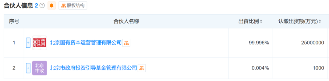 北京国有资本运营管理有限公司(简称北京国管)与北京市政府投资引导基金管理有限公司共同出资设立了该基金,持股比例分别为99.996%和0.004%,认缴出资额分别为2500亿元和1000万元。