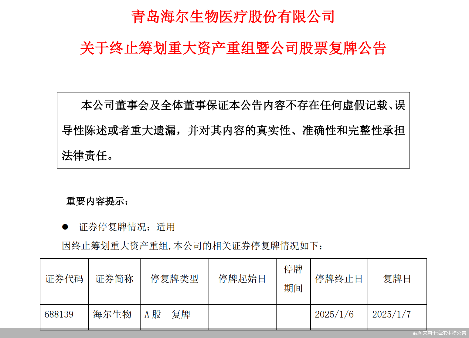 1月6日晚间,海尔生物和上海莱士分别发布公告,宣布终止此次换股吸收合并交易,并决定自1月7日起复牌。公告指出,由于交易结构复杂,尚未形成各方认可的具体方案,因此决定终止。
