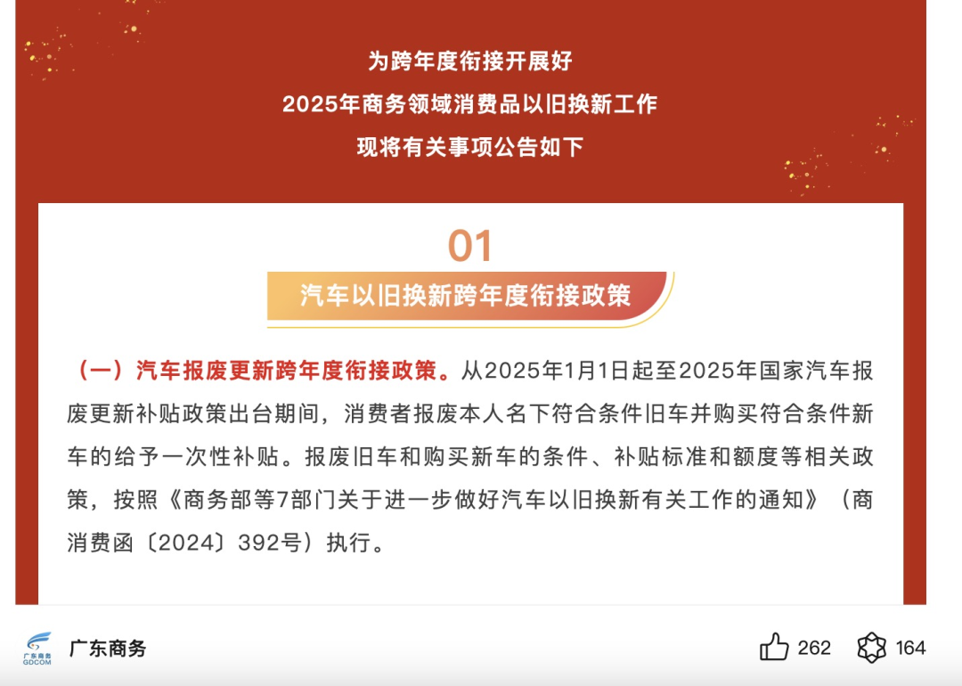 广东省商务厅于2025年1月1日发布公告,宣布继续开展包括汽车报废更新、家电以旧换新在内的多项以旧换新活动,并明确了2025年的具体细则。随后,湖南、江苏、海南、上海、湖北、贵州等省份也相继发布了“以旧换新”的延续政策。