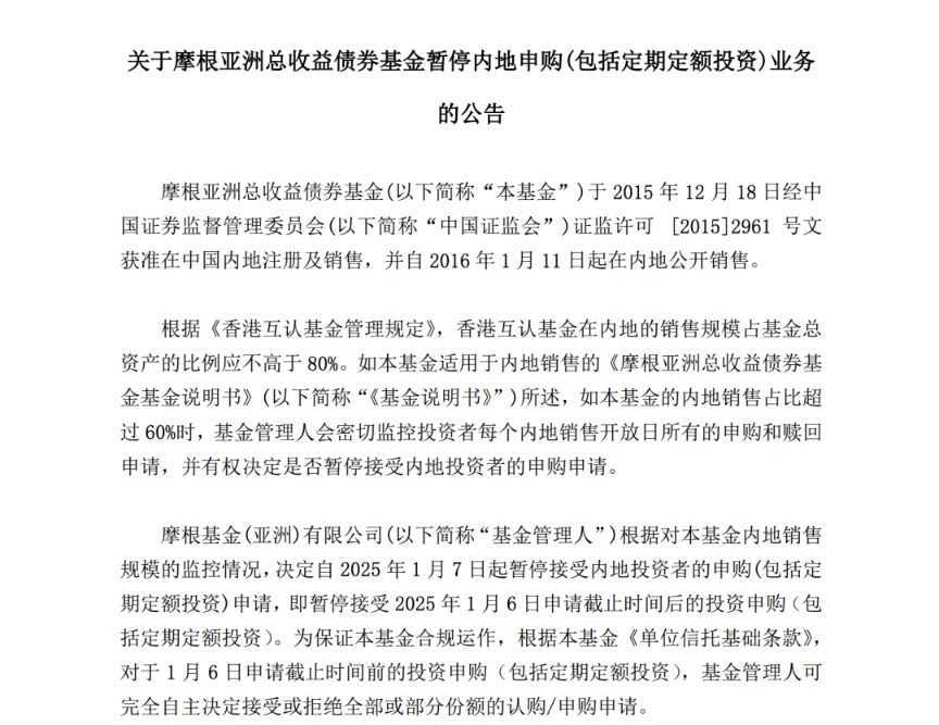 摩根亚洲总收益债券基金暂停内地申购公告截图来源:公司公告