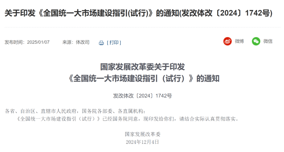 国家发改委发布《全国统一大市场建设指引(试行)》