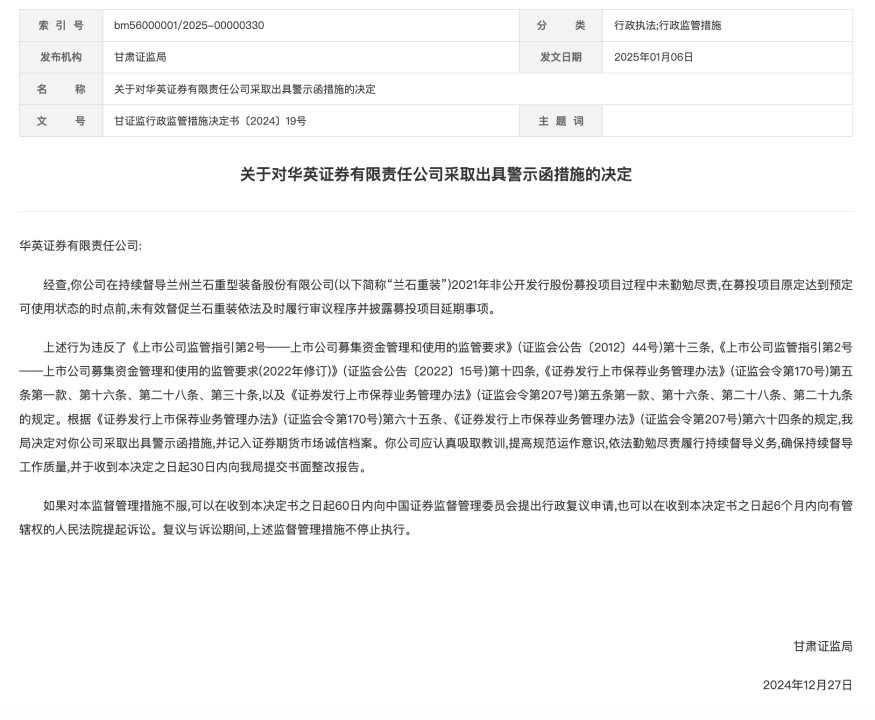 甘肃证监局于1月6日公布对华英证券的处罚决定。据悉,华英证券在持续督导兰石重装2021年非公开发行股份募投项目过程中,未勤勉尽责,未能及时督促兰石重装依法履行审议程序并披露募投项目延期事项。