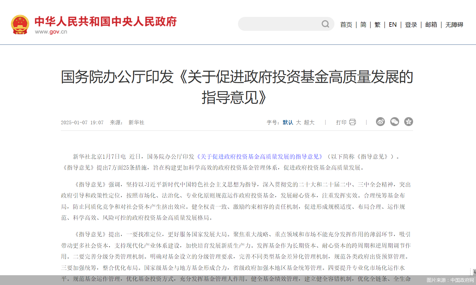 国务院办公厅发布《关于促进政府投资基金高质量发展的指导意见》,提出7方面25条措施,旨在构建科学高效的政府投资基金管理体系,促进政府投资基金高质量发展。