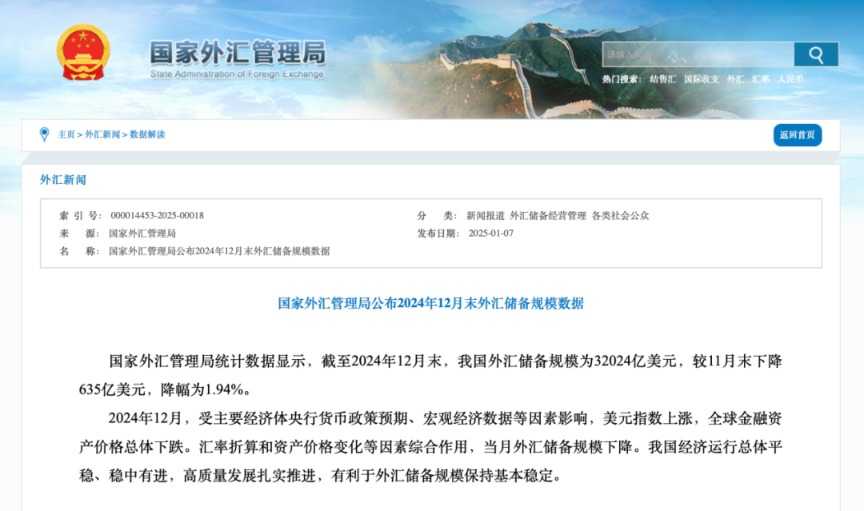 据数据,截至2024年12月末,我国外汇储备较上月末减少635亿美元,至32024亿美元,降幅为1.94%。国家外汇管理局指出,受主要经济体货币政策预期调整和宏观经济数据等因素的影响,2024年12月美元指数上升,全球金融资产价格普遍下跌,导致外汇储备规模有所下降。但我国经济持续平稳运行,高质量发展取得新进展,为外汇储备规模保持基本稳定提供了坚实基础。