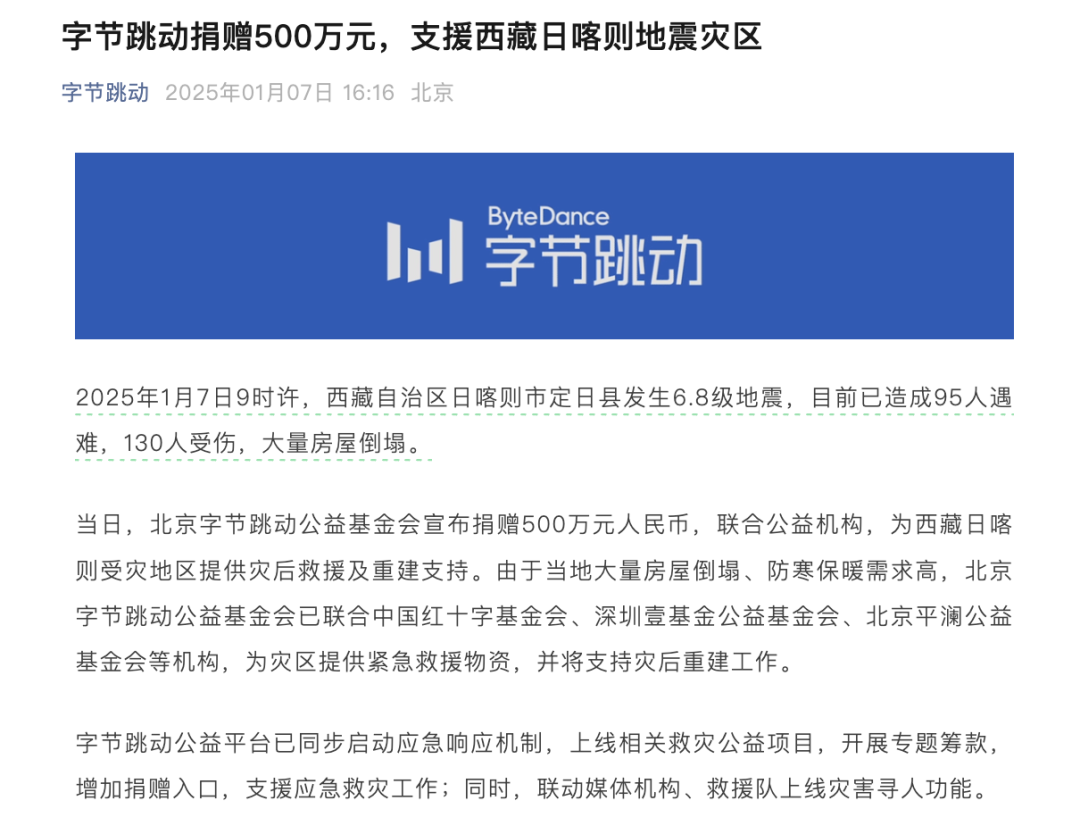 字节跳动紧随其后,北京字节跳动公益基金会捐赠500万元,支持灾后救援及重建。其公益平台亦启动应急响应,上线救灾项目,开展筹款,并联动媒体、救援队提供灾害寻人服务。