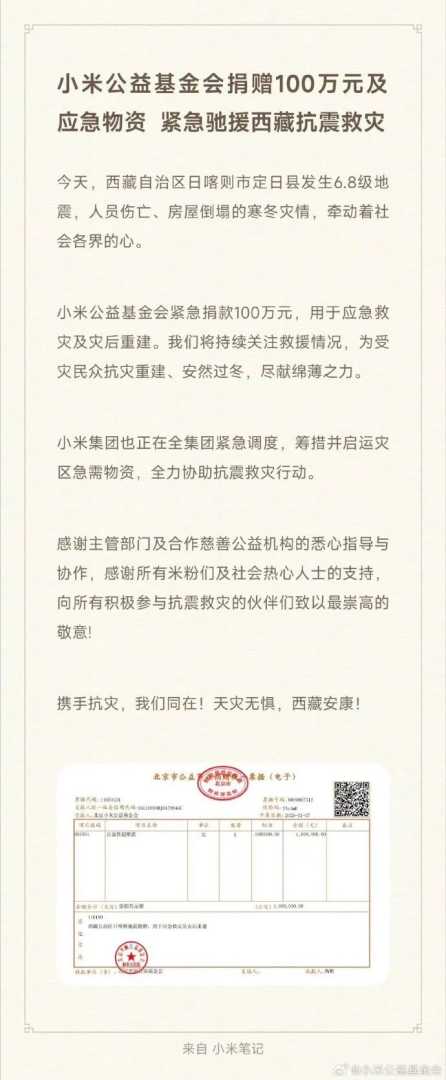 小米公益基金会亦捐款100万元及急需物资,全力支持抗震救灾。同时,小米集团正紧急调度物资,运往灾区。