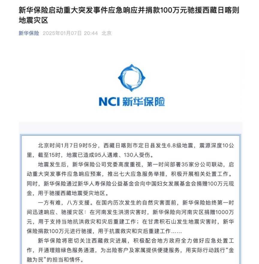 新华保险亦迅速响应,通过新华人寿保险公益基金会捐赠100万元,用于驰援灾区。同时,公司开通理赔绿色服务通道,为出险客户提供便捷服务。