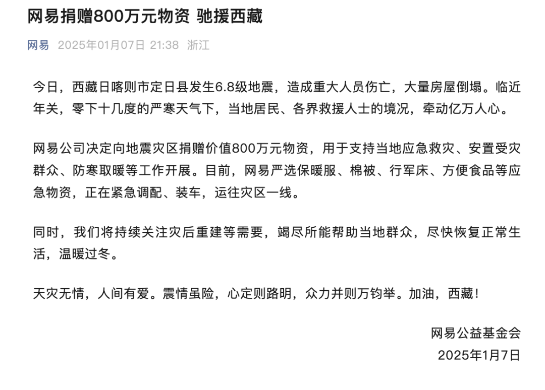 网易亦决定捐赠价值800万元物资,支持灾区应急救灾、安置群众及防寒取暖等工作。目前,保暖服、棉被等应急物资正在紧急调配中。