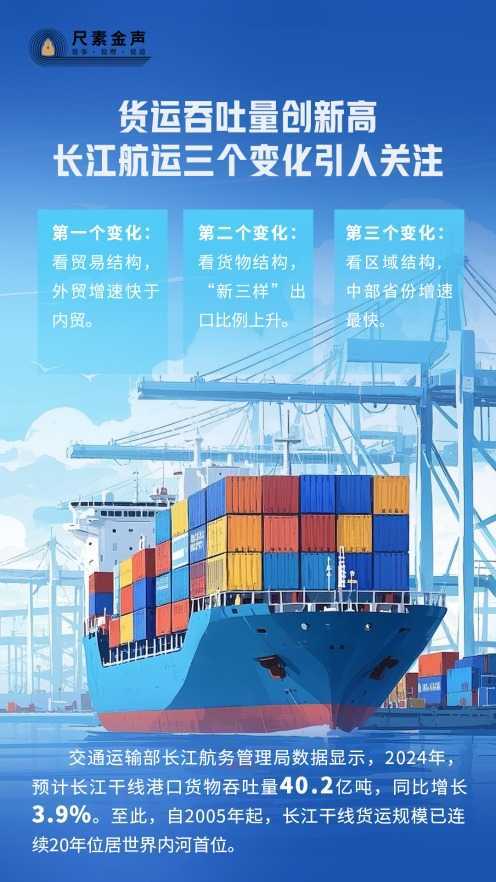 2024年长江干线港口货物吞吐量预计达到40.2亿吨,同比增长3.9%,连续20年位居世界内河首位。外贸增速快于内贸,“新三样”出口比例上升,中部省份增速最快,长江航运展现新趋势。