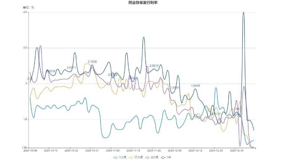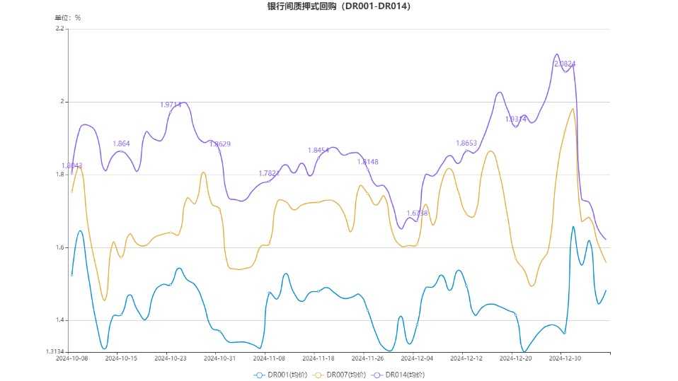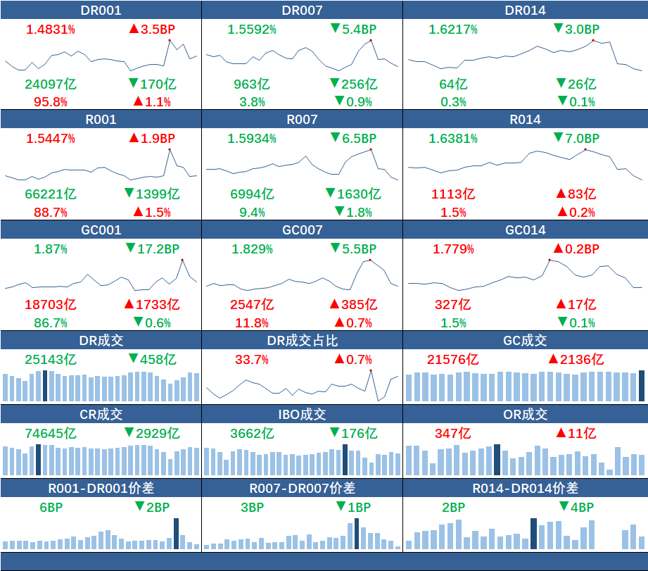 在银行间质押式回购市场,隔夜品种呈现小幅上涨趋势,而7D和14D品种则继续下行。具体而言,DR001和R001的加权平均利率分别上行3.5BP和1.9BP,报1.4831%和1.5447%,但成交额分别减少了170亿元和1399亿元。DR007和R007的加权平均利率则分别下行5.4BP和6.5BP,报1.5592%和1.5934%,成交额同样有所减少。DR014和R014的加权平均利率也分别下行,成交额则出现一增一减的情况。