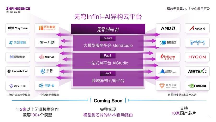 “天工平台”由上海电信搭建数字底座,并提供东部或西部、NVIDIA或国产算力资源供选择。平台秉承模型中立原则,既有电信自研星辰大模型,也有书生浦语等沪产主流大模型。平台生态伙伴无问芯穹则发挥其在混合训练、推理加速、算力调度等方面的专长。无问芯穹联合创始人兼CEO夏立雪介绍,我国的大模型训练往往需要多种芯片混合完成。依托先进的计算架构和高效的软硬件联合优化实力,无问芯穹发布了全球首个支持单任务千卡异构混训的Infini-AI异构云平台,实现6种中外芯片间的两两混训,算力利用率最高可达97.6%。
