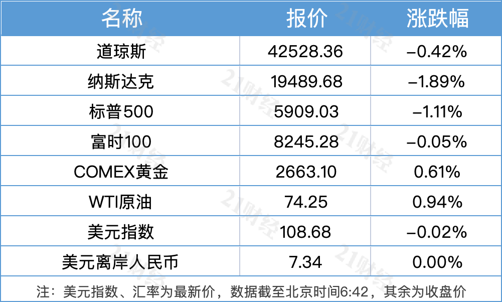1、美股市场收跌,纳指、标普500指数、道指均呈现下跌态势,其中英伟达收跌超6%。