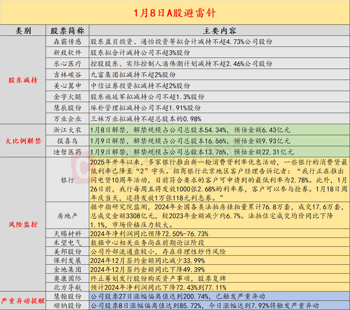 天赐材料预计2024年净利润同比大降72.50%-76.73%;禾望电气数据中心业务仍在前期论证;美邦股份因外部流通盘小,存在非理性炒作风险;多家公司股东计划减持股份,包括森霸传感、新致软件、乐心医疗等;保利发展、金地集团2024年12月签约金额均大幅下滑;奥康国际终止发行股份购买资产,股票复牌;北方导航预计2024年净利润同比下降72.43%到77.11%。