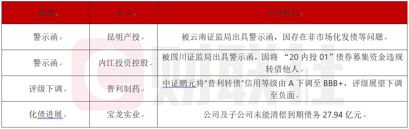 昆明产投、内江投控因债券发行及资金转借问题被监管警示,普利制药因财务造假被下调信用等级,宝龙实业未能清偿到期债务27.94亿元,面临较大偿债压力。