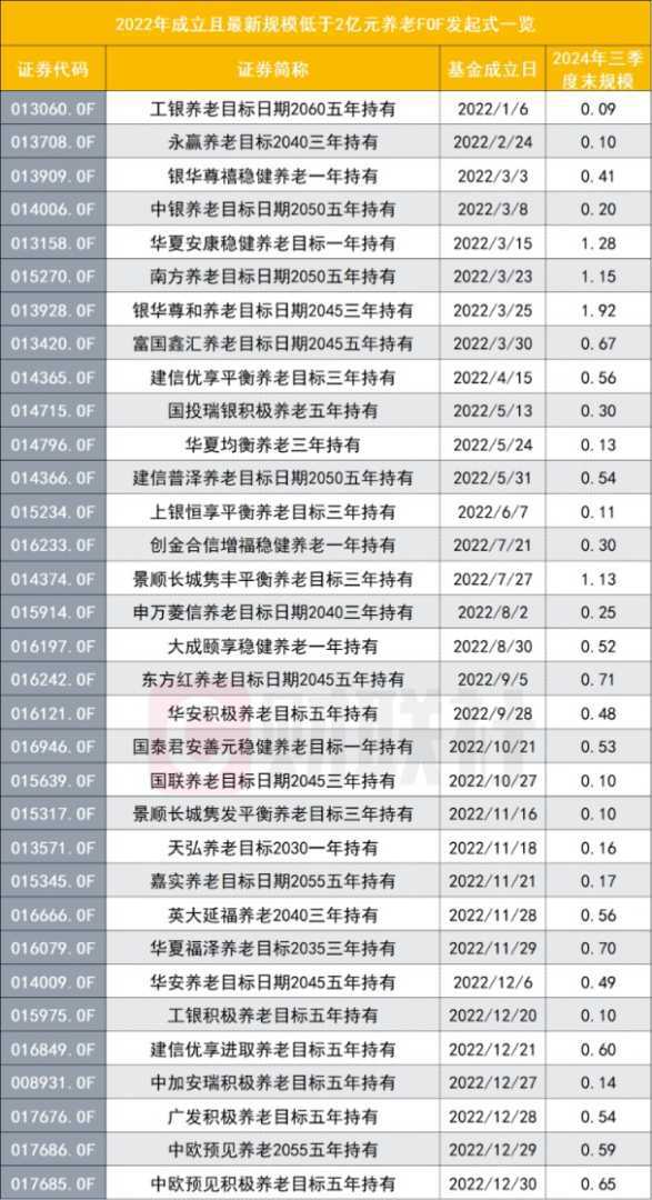 然而,收益回暖的养老FOF仍面临规模困境。Wind数据显示,截至去年三季度,有33只成立日期为2022年的发起式养老FOF规模不足2亿元。这意味着,这些产品将在2025年迎来成立3年的考验,如果成立3年后的对应日规模仍未达到2亿元,那么清盘的情形将继续出现。此外,近一年新成立的13只养老FOF中,仅有4只成立规模超过2亿元,其余成立规模均不足1亿元。