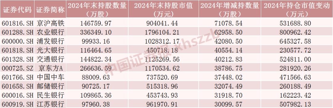 从持股增加数来看,2024年北向资金对京沪高铁的持股增加数最多,达到了7.11亿股。农业银行、浦发银行的持股增加数也分别达到了6.30亿股和4.21亿股。此外,光大银行、交通银行的持股增加数也均超过了4亿股。