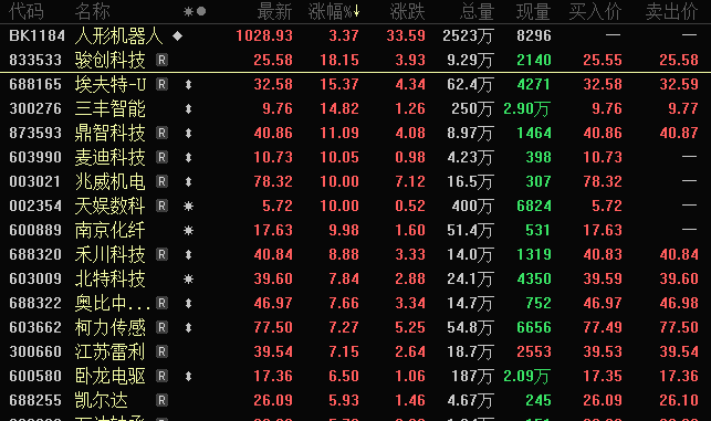 科技题材在午后迎来大幅拉升,成为大盘上涨的主要驱动力。人形机器人、减速器、抖音概念、工业软件及人工智能等板块拉升显著,尤其是人形机器人板块,午后最低跌近2.6%,但随后反弹至4.2%以上,收盘时涨幅虽有所回落,但仍表现抢眼。概念股如埃夫特-U、爱仕达、兆威机电、天娱数科及南京化纤等午后一度触及涨停板。