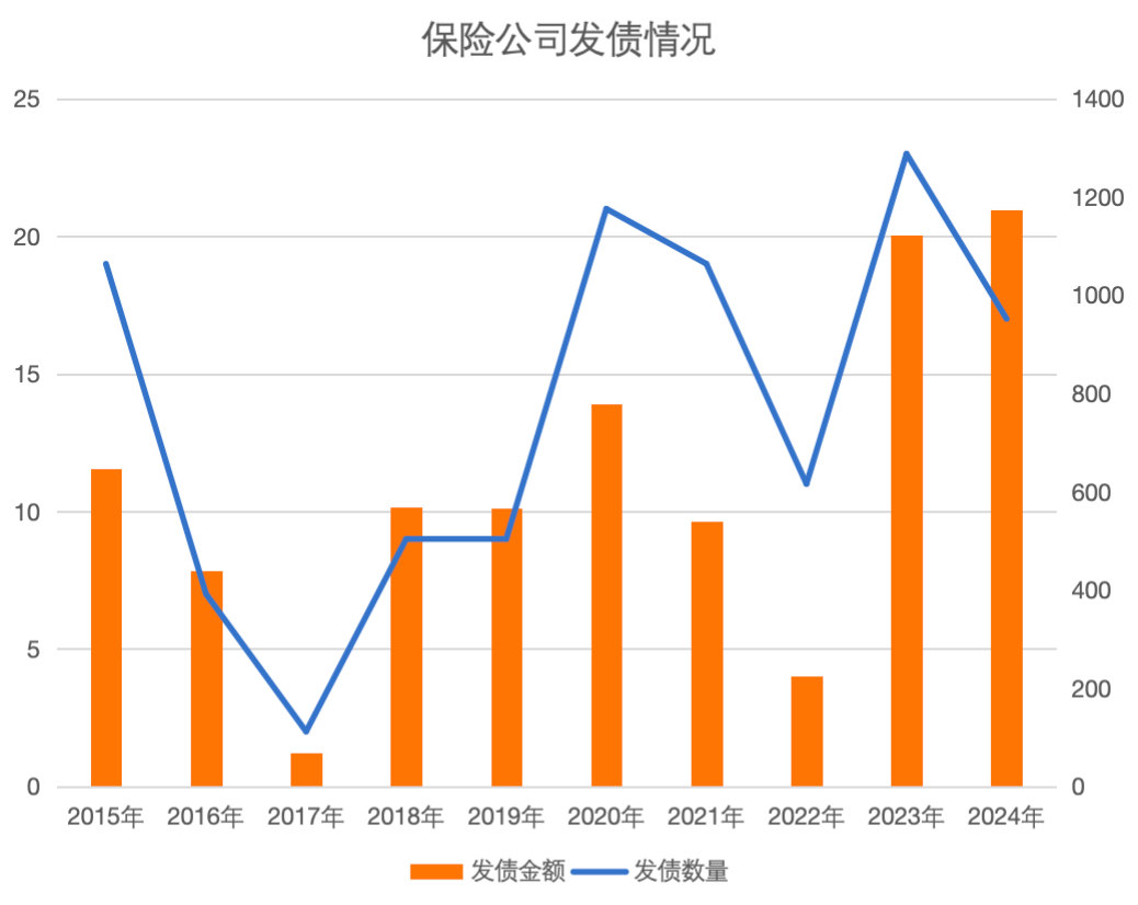 据统计,2024年商业银行次级债券的发行规模已接近1.90万亿元,其中二级资本债券及永续债(简称“二永债”)的发行规模更是高达1.67万亿元,刷新了历史记录。同时,保险公司也通过发行债券的方式积极“补血”,2024年的发债规模再次突破千亿元大关,同样创造了历史新高。