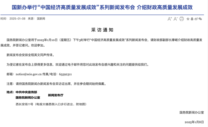国务院新闻办公室定于2025年1月10日(星期五)下午3时,隆重召开“中国经济高质量发展成效”系列新闻发布会。此次发布会将聚焦于财政领域的高质量发展成果,特邀财政部副部长廖岷出席并发表主题演讲,详细介绍财政在推动经济高质量发展方面的具体成效及未来规划。随后,廖副部长还将就相关话题回答现场记者的提问,深入解析财政政策的实施效果与影响。