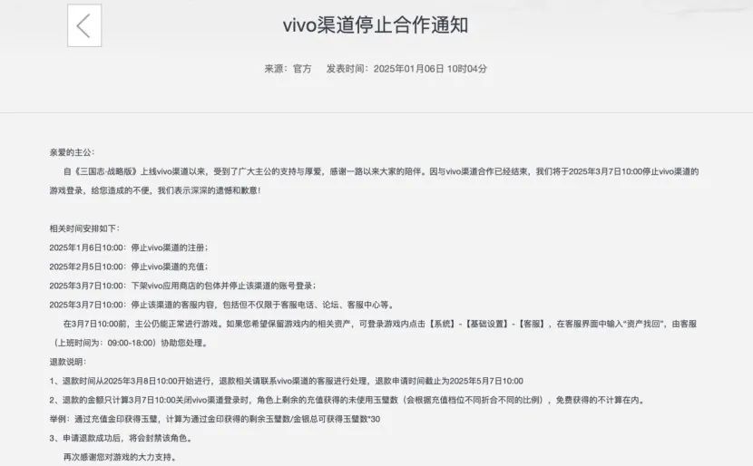 2025年,游戏厂商与渠道之间的博弈依旧激烈。1月6日,阿里灵犀互娱旗下热门SLG游戏《三国志·战略版》宣布,因与vivo渠道合作终止,将于2025年3月7日下架vivo应用商店的包体,并停止vivo渠道的账号登录。此前,该游戏已于2025年1月6日停止vivo渠道的注册,2025年2月5日停止vivo渠道的充值,vivo渠道服玩家可申请退款或联系客服协助资产找回。