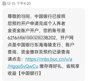 山东的马先生也遭遇了“跨省开户”,他在山东工作、开户,却在中国银行江苏连云港的一家支行被开通了个人养老金账户。中国银行工作人员称,马先生曾预约开通,但马先生表示当时只是将手机交给工作人员进行认证,并未被告知是开通个人养老金账户。此外,河南的余先生也“被开户”,开户网点位于广东佛山,他收到的是兴业银行的开户短信,原因是他在京东上预约了开户。