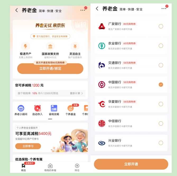 除了银行直接营销,电商平台也参与其中,通过优惠券、红包等方式吸引用户开通个人养老金账户。然而,账户易开通难注销,一旦有余额,包括活动奖励的体验金红包,就无法直接注销,只能在不同银行间转移。