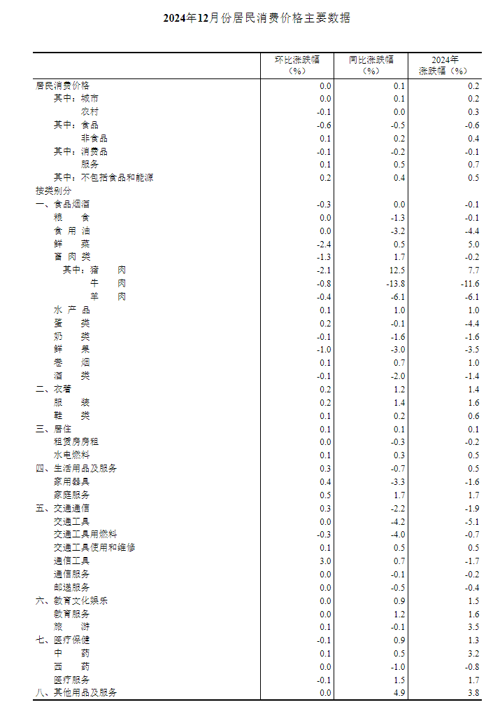2024年12月CPI数据发布:同比上涨0.1%,整体平稳运行