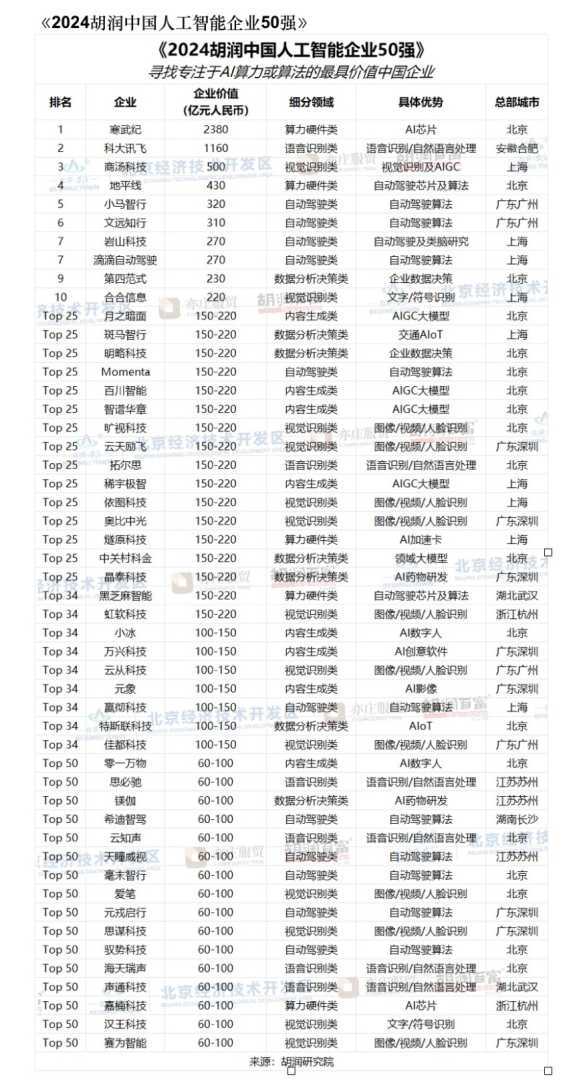 2024胡润中国人工智能企业50强榜单揭晓