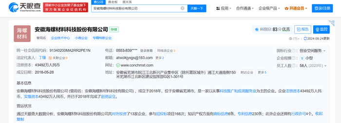 海螺材料科技成立于2018年,位于安徽省芜湖市,注册资本43492万人民币,实缴资本同样为43492万人民币。其第一大股东为海螺科创,后者由安徽省国资委旗下安徽投资集团(皖投集团)和海螺创业(00586.HK)旗下芜湖海创实业分别持股51%和49%。皖投集团作为安徽省最大的国有综合性投资公司之一,承担着保障重要基础设施建设、引领产业升级、服务创新发展战略任务。
