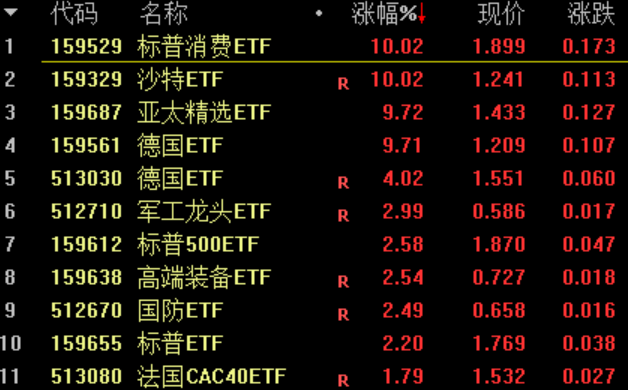 跨境ETF正成为资金追逐的热门对象。2025年1月9日,多只跨境ETF尾盘表现抢眼,其中标普消费ETF(159529)溢价率飙升至51.82%,涨幅达10%并触及涨停。沙特ETF(159329)溢价率超20%,同样尾盘涨停。标普500ETF(159612)和德国ETF(159561)等多只基金的溢价率也纷纷超过10%。
