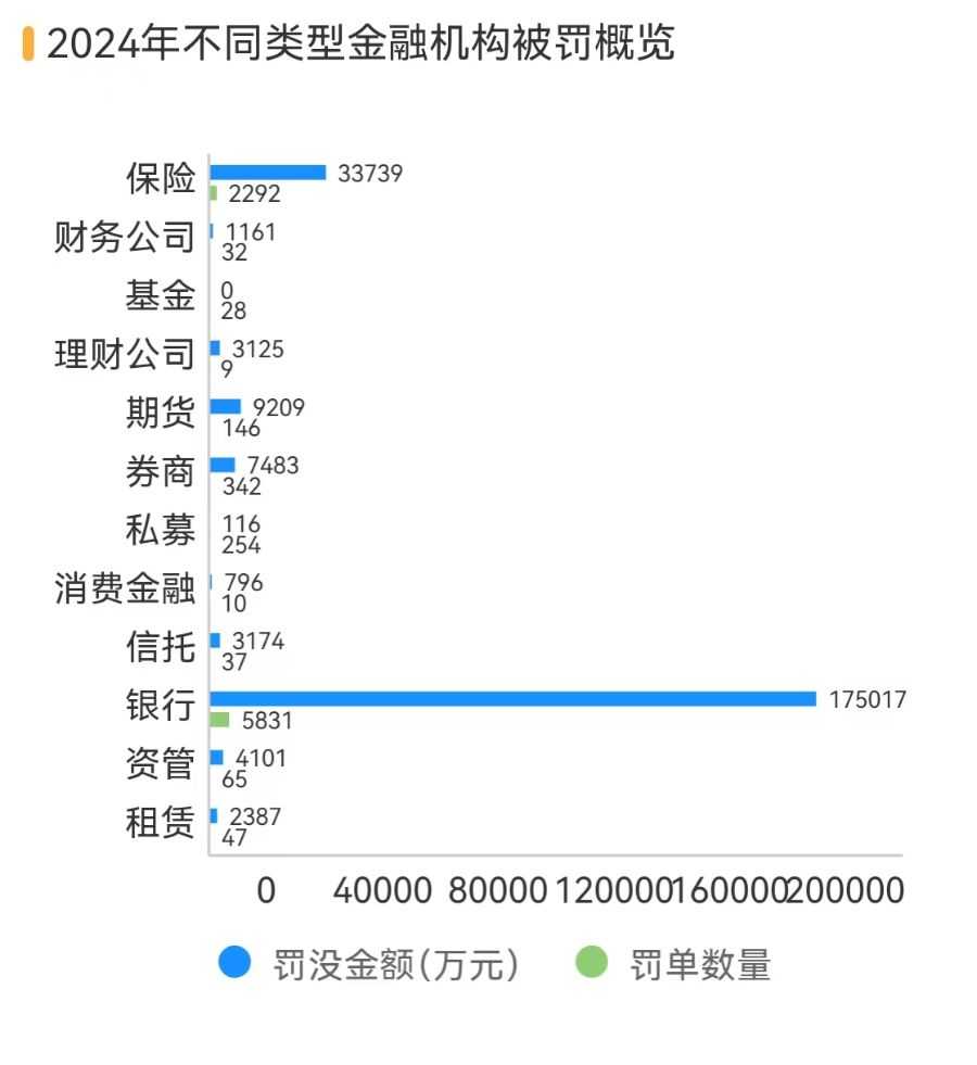 2024年,金融机构共接到9093张罚单,同比下降32.05%,总罚金达到24.03亿元,降幅为26.95%。银行、保险、券商、基金、信托等行业罚单数量均有所减少,唯独理财公司罚单数量上升。