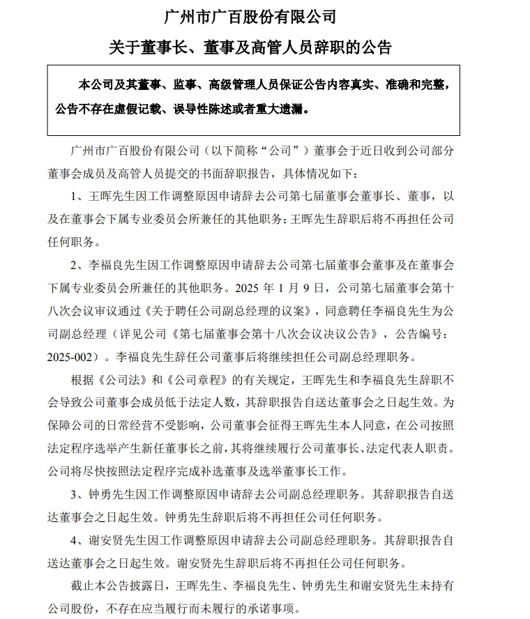 1月9日晚间,广百股份(002187.SZ)发布重要公告,公司董事会于近期收到了来自部分董事会成员及高管人员的书面辞职报告。此次辞职涉及多位关键人物: