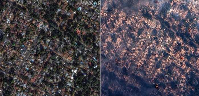 (加州洛杉矶县社区火灾前后对比,来源:MAXAR)
