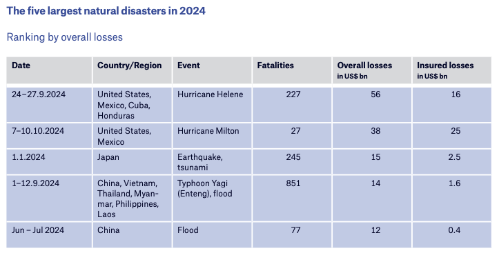 在整个2024年中,9月袭击中国、越南、菲律宾等地的台风“摩羯”是造成死亡人数最多的自然灾害,共导致851人死亡。慕尼黑再保险指出,“摩羯”造成的经济损失高达140亿美元,其中16亿美元属于保险赔付范围。