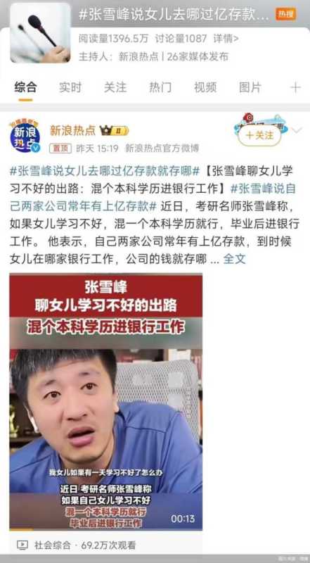 近日,考研名师张雪峰因发表“存款兜底女儿就业”言论而引发社会广泛关注。张雪峰在视频中透露,若女儿学习不佳,则只需取得本科学历,毕业后可进入银行工作,其旗下公司常年存款均上亿元,将根据公司存款选择女儿工作的银行。