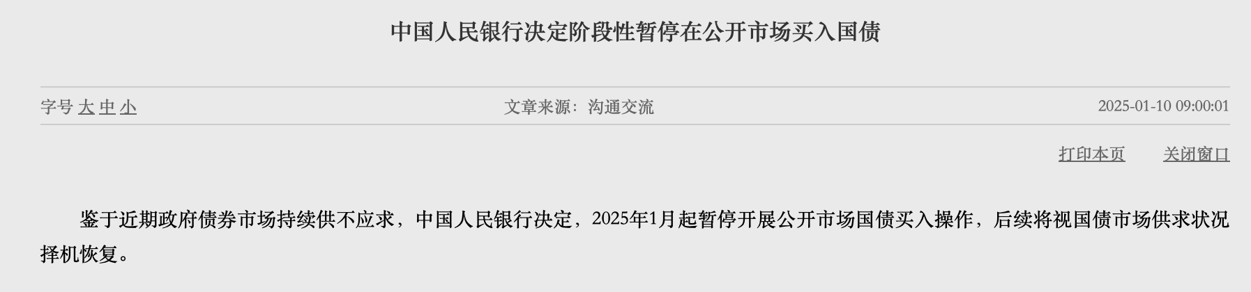中国人民银行因政府债券市场供不应求,决定自2025年1月起暂停公开市场国债买入操作,后续将视市场供求状况择机恢复。