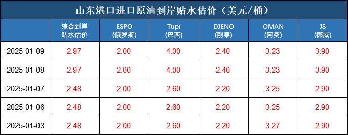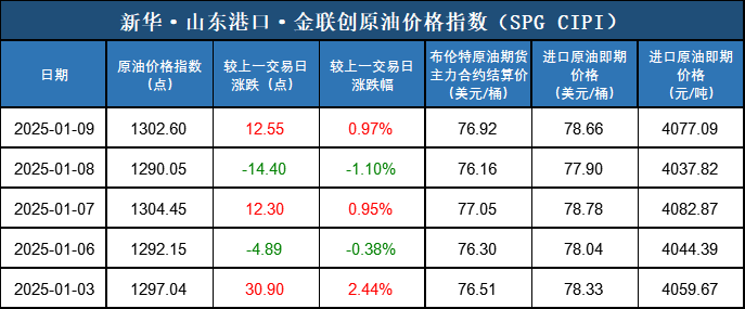 新华财经北京1月10日电(郑大伟)截至2025年1月9日,新华·山东港口·金联创原油价格指数(SPG CIPI)报1302.60点,较前一日上涨12.55点,涨幅达到0.97%。同时,进口原油即期价格为78.66美元/桶,折合人民币为4077.09元/吨。值得注意的是,山东港口进口原油综合到岸贴水估价为2.97美元/桶,与前一日持平。
