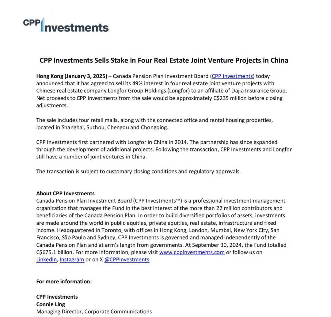 日前,加拿大养老金计划投资委员会(CPP Investments)宣布,已同意将其与龙湖集团合作的四个房地产合资项目中49%的权益,转让给大家保险的一家子公司。这些项目分别位于上海、苏州、成都和重庆,均为龙湖旗下知名的天街综合体,涵盖零售商场、写字楼及租赁住房等多元业态。